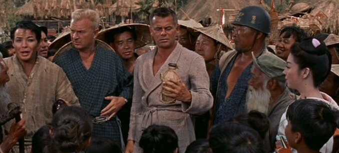 In THE TEAHOUSE IN THE AUGUST MOON van Daniel Mann uit 1956 speelt een schmierende Marlon Brando (op de foto links) een Japanse gids die ons rondleidt in Okinawa wanneer de Amerikanen na de oorlog Japan "beschaving en democratie" willen bijbrengen. Dat olv Glenn Ford (met fles), door wiens toedoen naar eigen zeggen de oorlog een paar maanden langer heeft geduurd. Ford heeft deze positie gekregen omdat hij als postmedewerker allergisch was geworden voor lijm. Erg leuke film waarin het Amerikaanse superioriteitsgevoel en het begrip democratie behoorlijk belachelijk gemaakt worden. En dat in 1956!